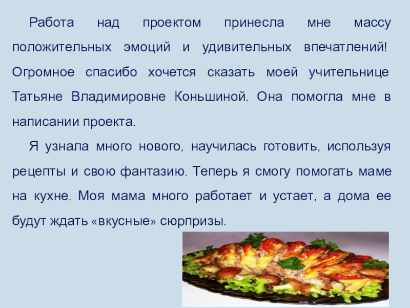 Я узнала много нового, научилась готовить, используя рецепты и свою фантазию. Теперь я смогу помогать маме на кухне. Моя мама много работает и устает, а дома ее будут ждать «вкусные» сюрпризы.