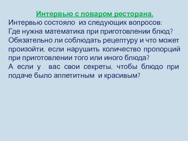 7. Узнать мнение профессионала (повара из ресторана) о возможности применения математических знаний при приготовлении различных блюд.