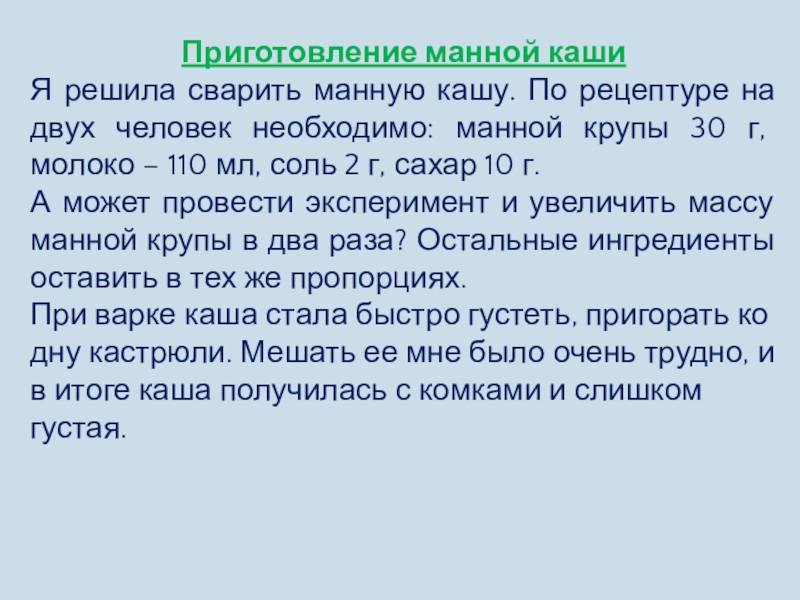 Я решила сварить манную кашу. По рецептуре на двух