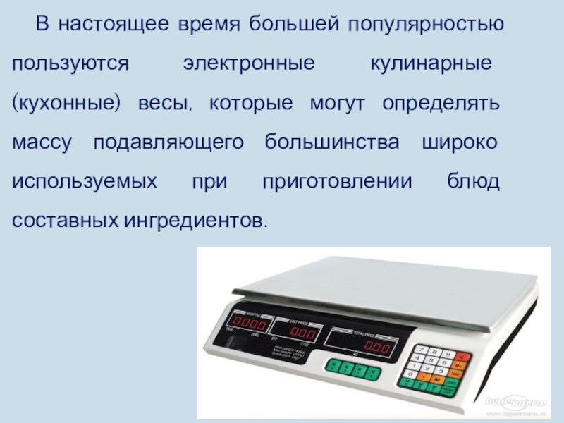 Слайд 15В настоящее время большей популярностью пользуются электронные кулинарные (кухонные) весы, которые