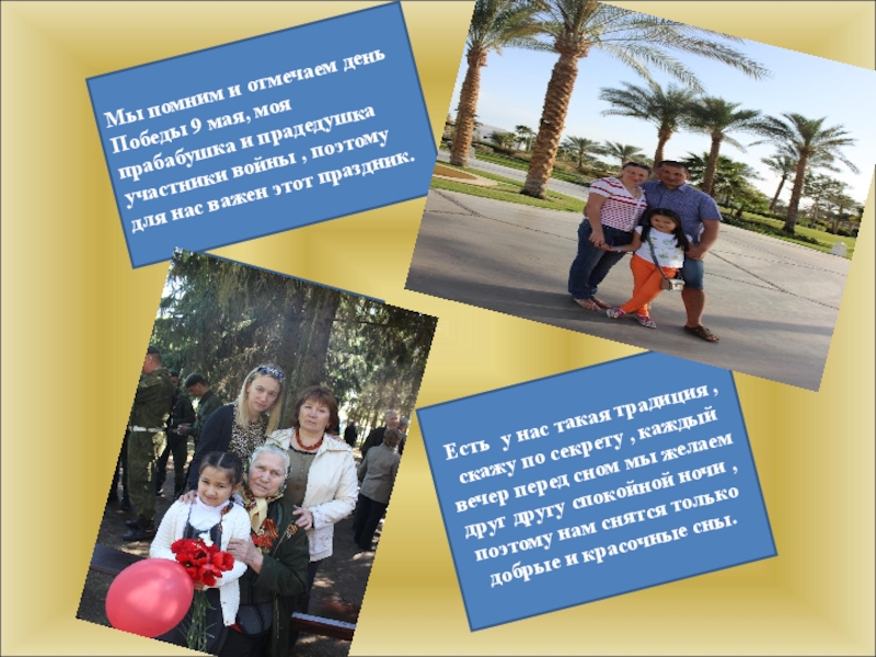 Мы помним и отмечаем день Победы 9 мая, моя прабабушка и прадедушка участники войны , поэтому для нас важен этот праздник.