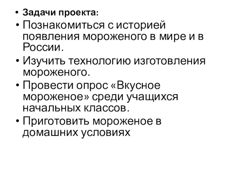 Задачи проекта:Познакомиться с историей появления мороженого в мире и в России.Изучить технологию изготовления мороженого.Провести опрос «Вкусное мороженое»