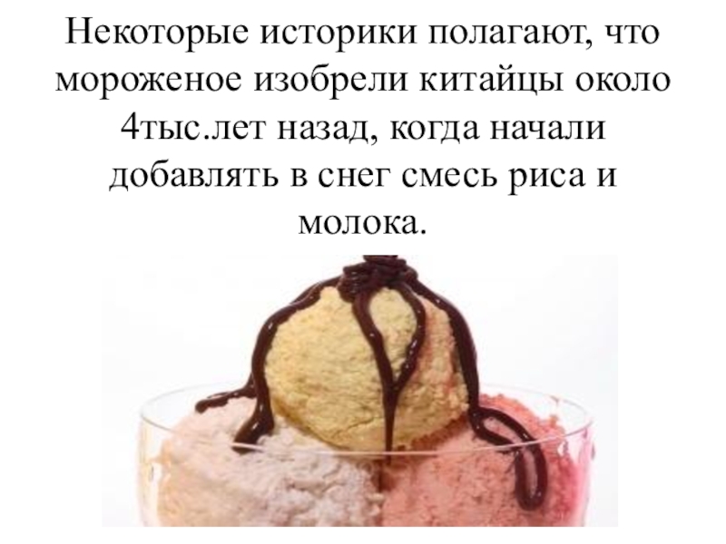 Слайд 7Некоторые историки полагают, что мороженое изобрели китайцы около 4тыс.лет назад, когда