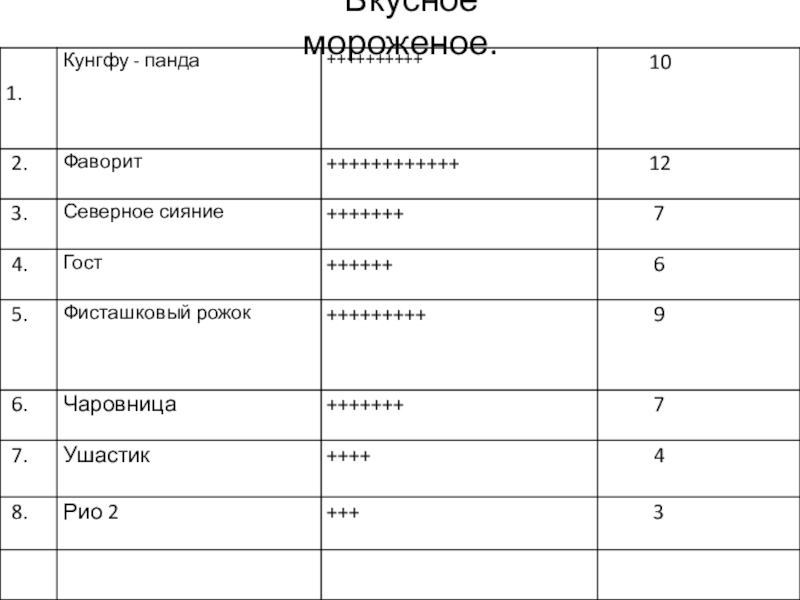 Провести опрос «Вкусное мороженое» среди учащихся начальных классов.