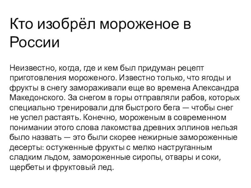 рецепт приготовления мороженого. Известно только, что ягоды и фрукты в снегу замораживали еще во времена Александра Македонского. За снегом в горы отправляли рабов, которых специально тренировали для быстрого бега — чтобы снег не успел растаять. Конечно, мороженым в современном понимании этого слова лакомства древних эллинов нельзя было назвать — это были скорее нежирные замороженные десерты: остуженные фрукты с мелко наструганным сладким льдом, замороженные сиропы, отвары и соки, щербеты и фруктовый лед.