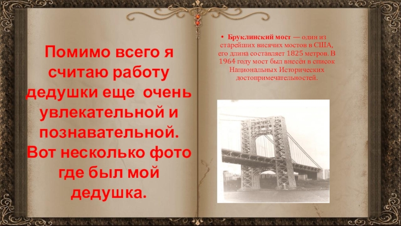 Бруклинский мост — один из старейших висячих мостов в США, его длина составляет 1825 метров. В 1964 году мост был внесён в список Национальных Исторических достопримечательностей.