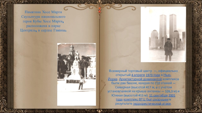 Всемирный торговый центр —, официально открытый 4 апреля 1973 года в Нью-Йорке. Архитектурной доминантой комплекса были две башни, каждая по 110 этажей — Северная (высотой 417 м, а с учётом установленной на крыше антенны — 526,3 м) и Южная (высотой 415 м). 11 сентября 2001 года комплекс ВТЦ был разрушен в результате террористической атаки.