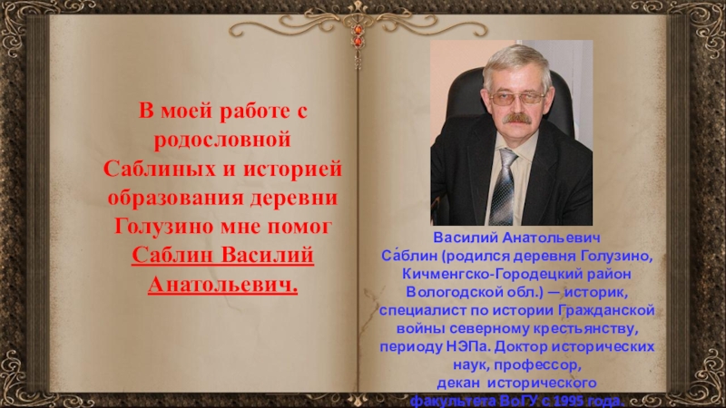 Василий Анатольевич Са́блин (родился деревня Голузино, Кичменгско-Городецкий район Вологодской обл.) — историк, специалист по истории Гражданской войны северному крестьянству, периоду НЭПа. Доктор исторических наук, профессор, декан исторического факультета ВоГУ с 1995 года.