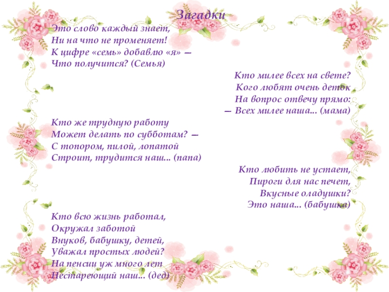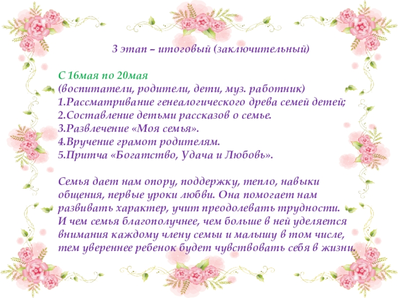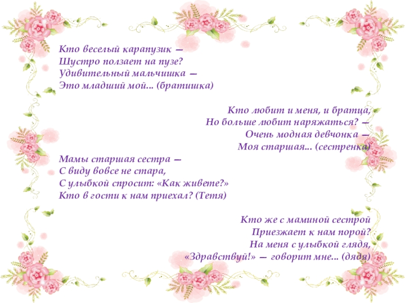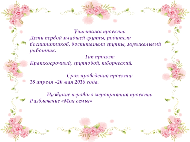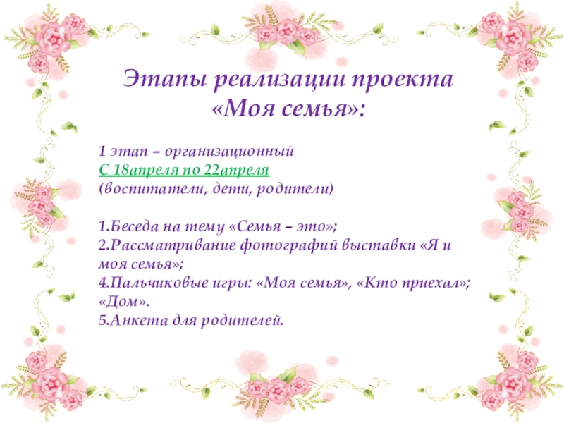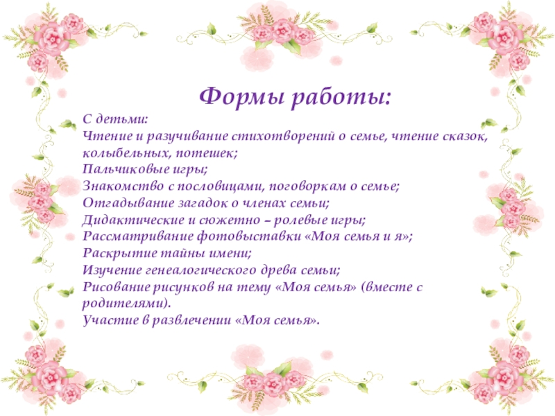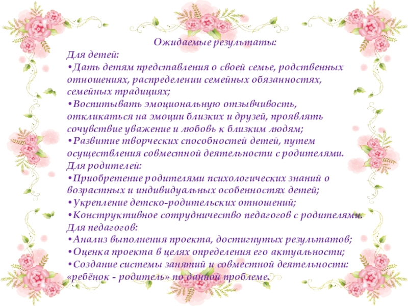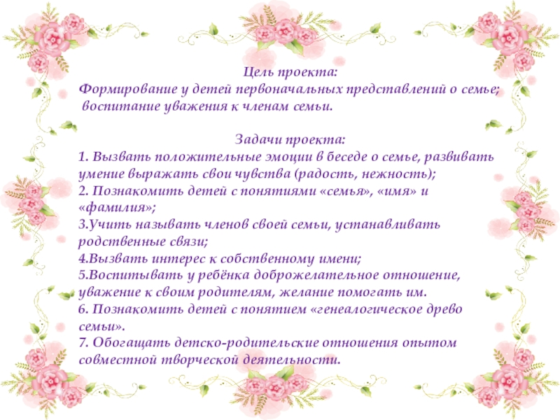 •Дать детям представления о своей семье, родственных отношениях, распределении