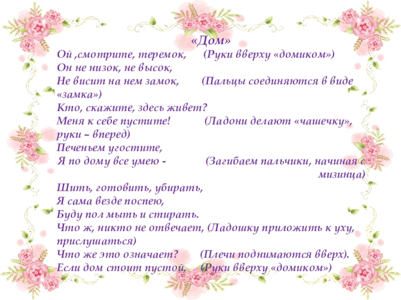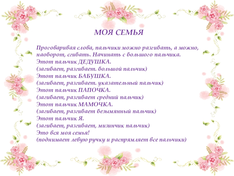 Проговаривая слова, пальчики можно разгибать, а можно, наоборот, сгибать. Начинать