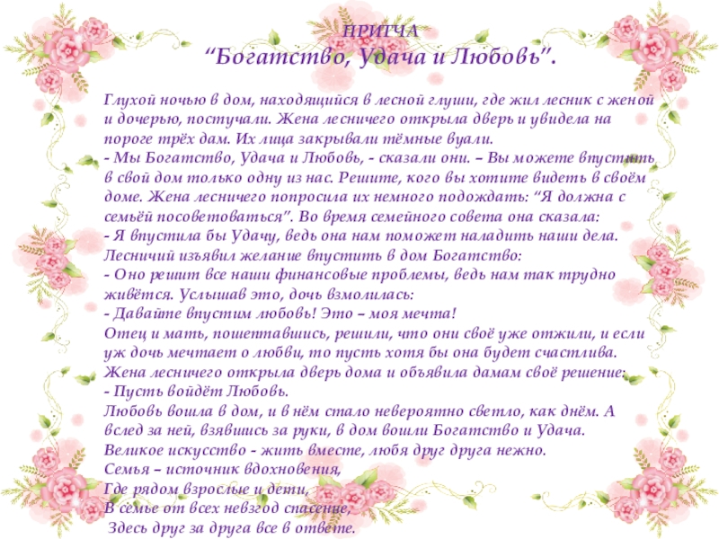 Об этом мы можем узнать из разговоров с детьми, рисунков и детских сочинений, а можно вспомнить своё детство, вспомнить родительский дом. У каждого из нас он свой, но есть и то общее, что связывает нас всех: здесь сказали свои первые слова, сделали первые шаги и совершили первые в своей жизни открытия. Дом – начало начал. Здесь рождается Любовь и Ненависть, Добро и Зло, Хамство и Порядочность. Невезение и Успех берут своё начало тоже здесь. Во всех испытаниях и бедах родной дом – убежище для души.