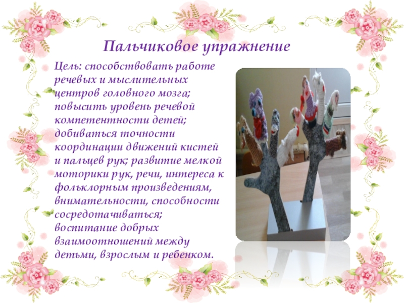 речевой компетентности детей; добиваться точности координации движений кистей и пальцев рук; развитие мелкой моторики рук, речи, интереса к фольклорным произведениям, внимательности, способности сосредотачиваться; воспитание добрых взаимоотношений между детьми, взрослым и ребенком.