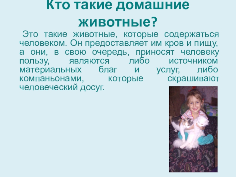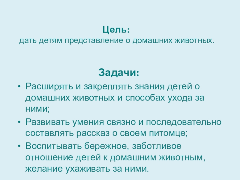 Воспитывать бережное, заботливое отношение детей к домашним животным, желание ухаживать за ними.