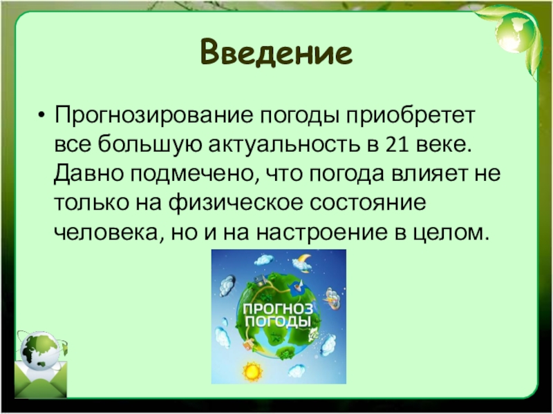 Погода – состояние атмосферы в той или иной местности в данный момент времени или в определенный промежуток времени.