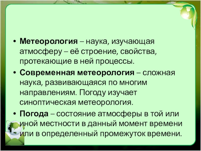 Слайд 6Метеорология – наука, изучающая атмосферу – её строение, свойства, протекающие в