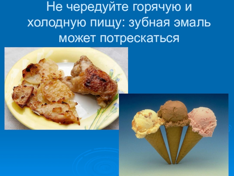 Слайд 29Не чередуйте горячую и холодную пищу: зубная эмаль может потрескаться