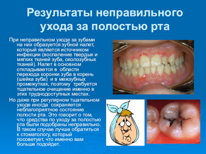 на них образуется зубной налет, который является источником инфекции (воспаление твердых и мягких тканей зуба, околозубных тканей). Налет в основном откладывается в области перехода коронки зуба в корень (шейка зуба) и в межзубных промежутках, поэтому требуется тщательное очищение именно в этих труднодоступных местах.