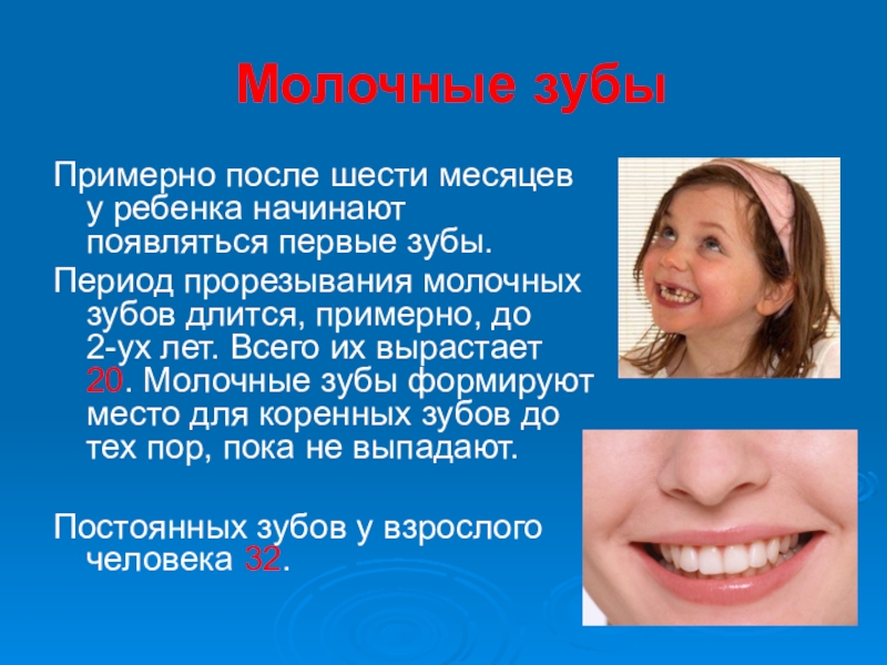 Период прорезывания молочных зубов длится, примерно, до 2-ух лет. Всего их вырастает 20. Молочные зубы формируют место для коренных зубов до тех пор, пока не выпадают.