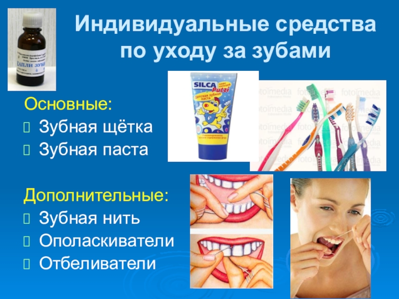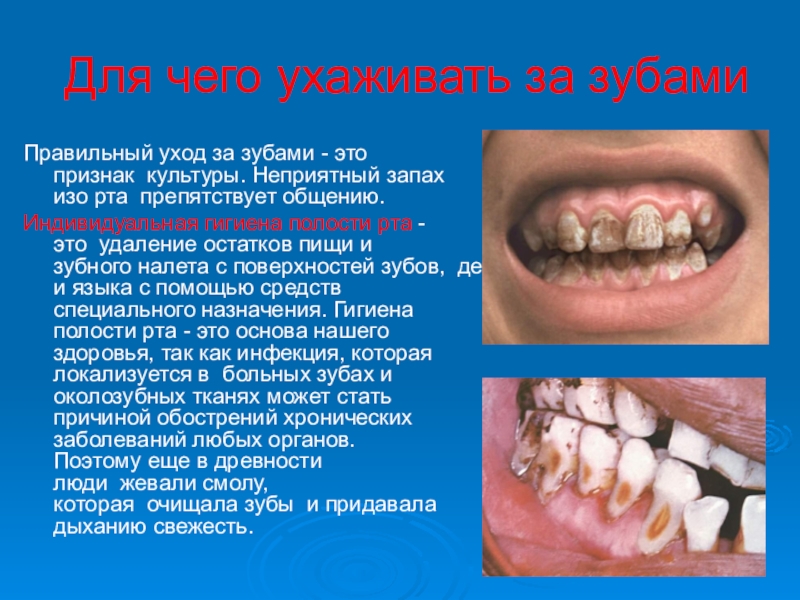 Индивидуальная гигиена полости рта - это удаление остатков пищи и зубного налета с поверхностей зубов, десен и языка с помощью средств специального назначения. Гигиена полости рта - это основа нашего здоровья, так как инфекция, которая локализуется в больных зубах и околозубных тканях может стать причиной обострений хронических заболеваний любых органов. Поэтому еще в древности люди жевали смолу, которая очищала зубы и придавала дыханию свежесть.