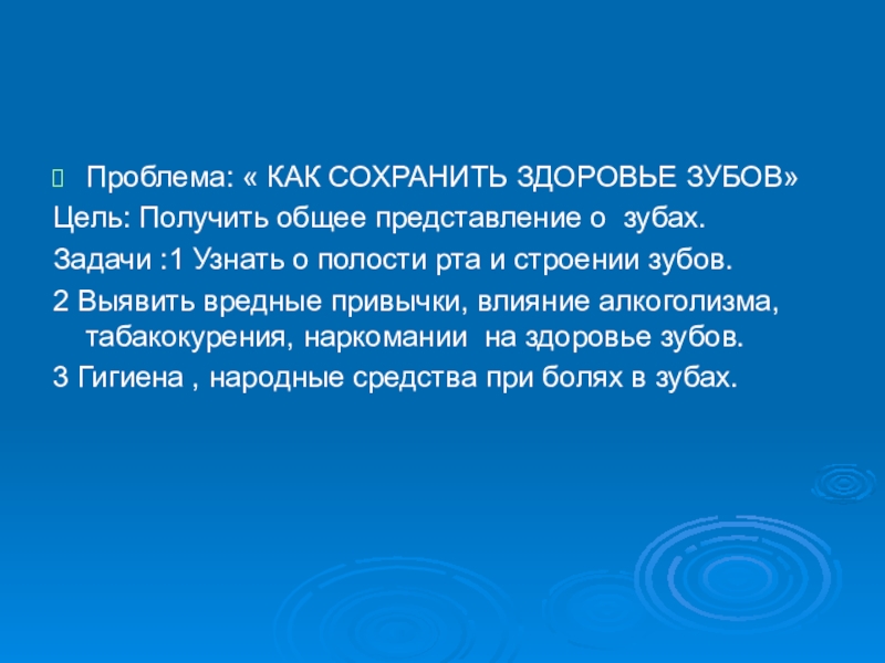 Слайд 2Проблема: « КАК СОХРАНИТЬ ЗДОРОВЬЕ ЗУБОВ»