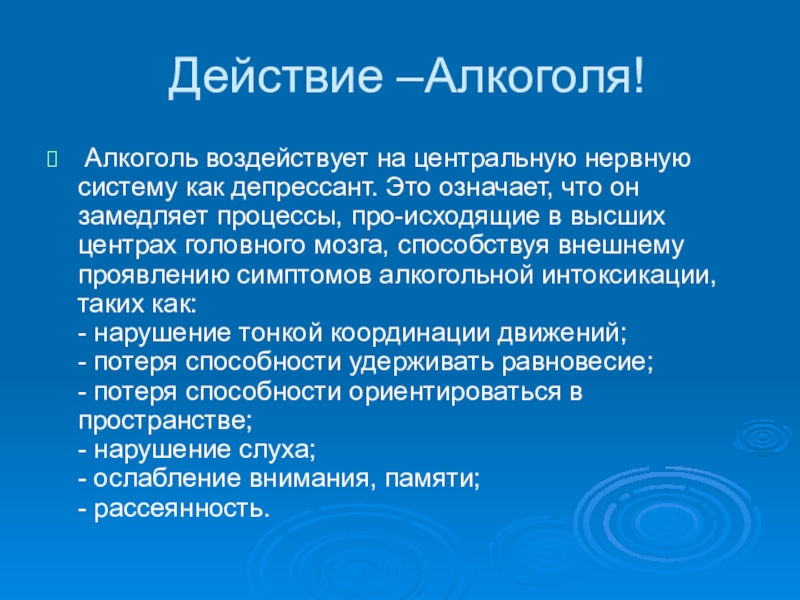 что он замедляет процессы, про-исходящие в высших центрах головного мозга, способствуя внешнему проявлению симптомов алкогольной интоксикации, таких как: