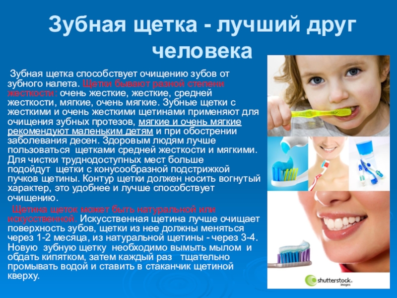 щетка способствует очищению зубов от зубного налета. Щетки бывают разной степени жесткости: очень жесткие, жесткие, средней жесткости, мягкие, очень мягкие. Зубные щетки с жесткими и очень жесткими щетинами применяют для очищения зубных протезов, мягкие и очень мягкие рекомендуют маленьким детям и при обострении заболевания десен. Здоровым людям лучше пользоваться щетками средней жесткости и мягкими. Для чистки труднодоступных мест больше подойдут щетки с конусообразной подстрижкой пучков щетины. Контур щетки должен носить вогнутый характер, это удобнее и лучше способствует очищению.