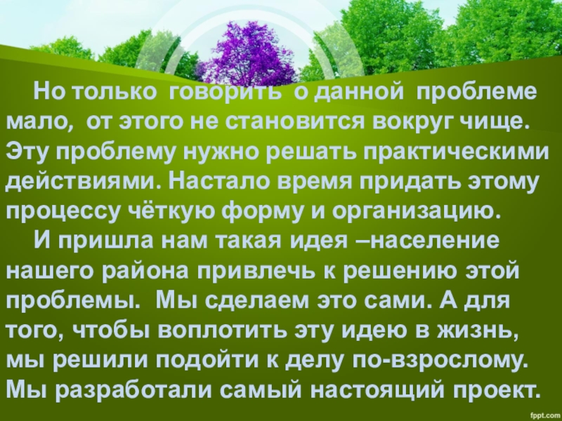 И пришла нам такая идея –население нашего района привлечь к решению этой проблемы. Мы сделаем это сами. А для того, чтобы воплотить эту идею в жизнь, мы решили подойти к делу по-взрослому. Мы разработали самый настоящий проект.