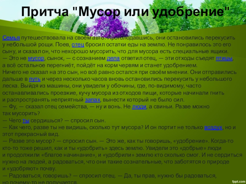 — Разве это мусор? — спросил сын. — Это же, как ты говоришь, «удобрение». Когда-то кто-то тоже решил, как и ты «удобрить» здесь землю. Увидели это «добрые» люди и продолжили «благое начинание», и «удобрили» землю кто сколько смог. И не сердиться нужно на людей, а радоваться, что они такие сознательные, что заботятся о природе и «удобряют» почву.