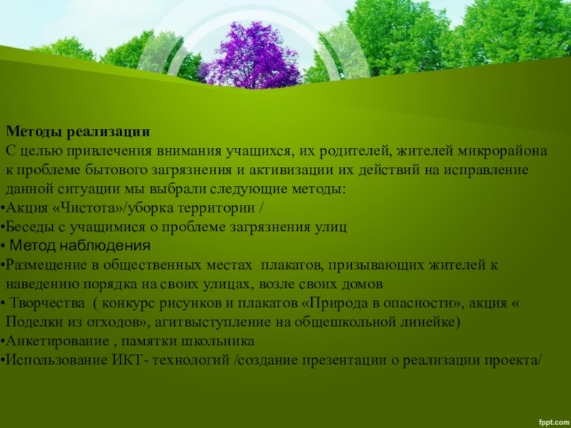 проблеме бытового загрязнения и активизации их действий на исправление данной ситуации мы выбрали следующие методы: