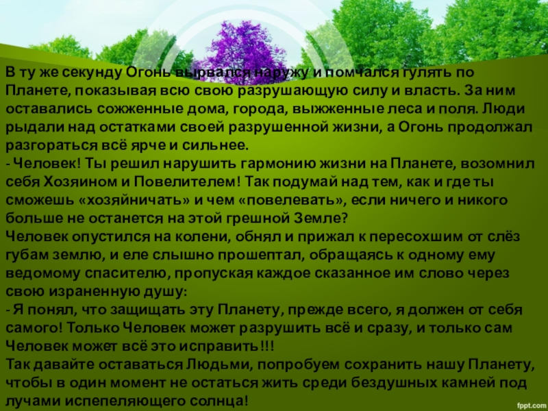- Человек! Ты решил нарушить гармонию жизни на Планете, возомнил себя Хозяином и Повелителем! Так подумай над тем, как и где ты сможешь «хозяйничать» и чем «повелевать», если ничего и никого больше не останется на этой грешной Земле?