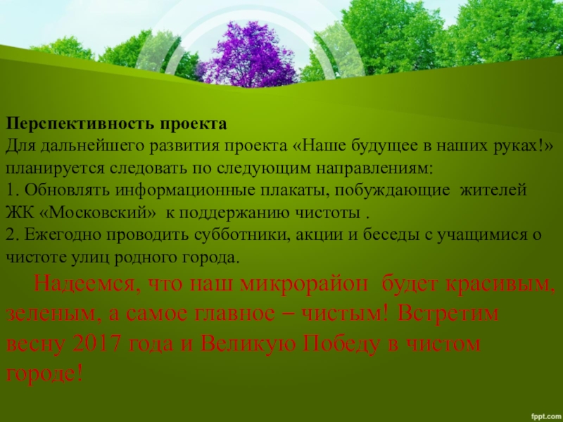 Надеемся, что наш микрорайон будет красивым, зеленым, а самое главное – чистым! Встретим весну 2017 года и Великую Победу в чистом городе!