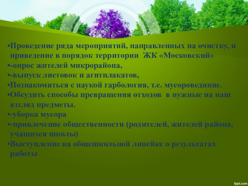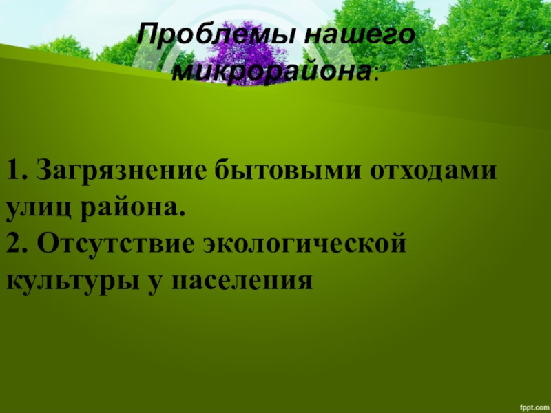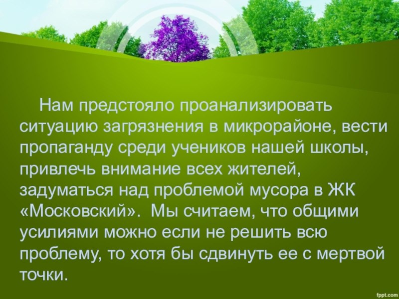 Слайд 15Нам предстояло проанализировать ситуацию загрязнения в микрорайоне, вести пропаганду среди учеников