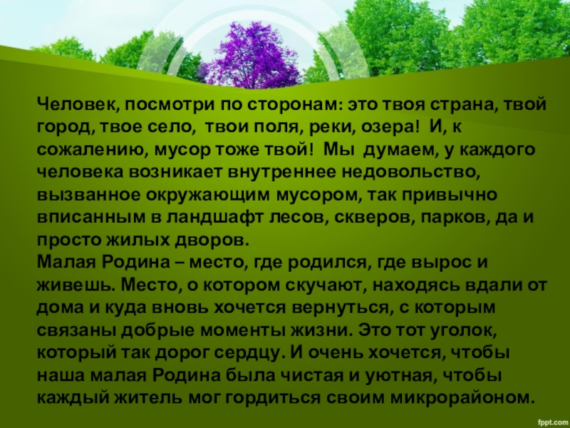 Малая Родина – место, где родился, где вырос и живешь. Место, о котором скучают, находясь вдали от дома и куда вновь хочется вернуться, с которым связаны добрые моменты жизни. Это тот уголок, который так дорог сердцу. И очень хочется, чтобы наша малая Родина была чистая и уютная, чтобы каждый житель мог гордиться своим микрорайоном.