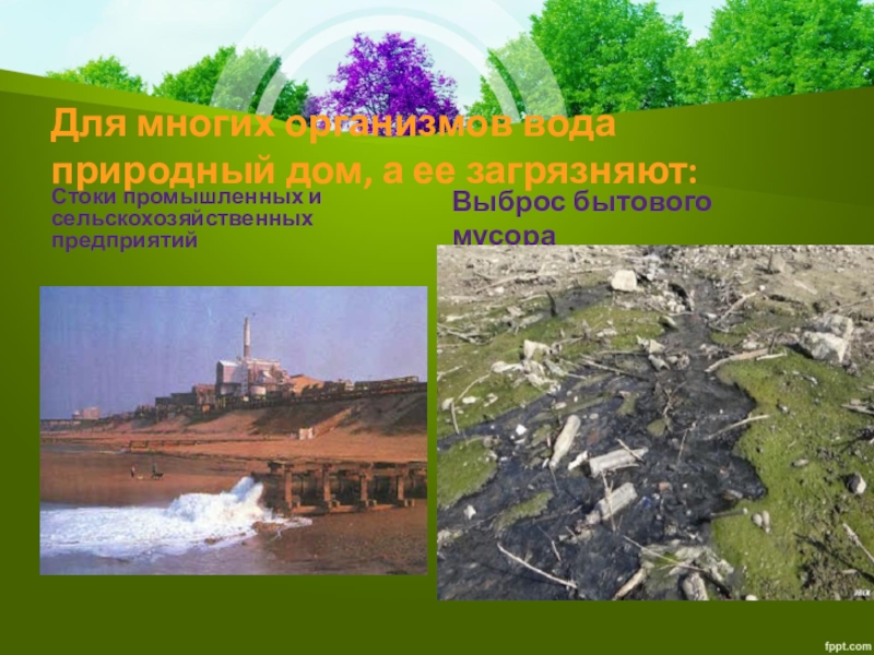 Слайд 17Для многих организмов вода природный дом, а ее загрязняют: