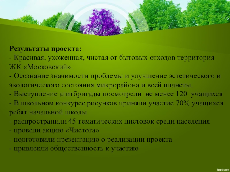 нашей школы, привлечь внимание всех жителей, задуматься над проблемой мусора в ЖК «Московский». Мы считаем, что общими усилиями можно если не решить всю проблему, то хотя бы сдвинуть ее с мертвой точки.