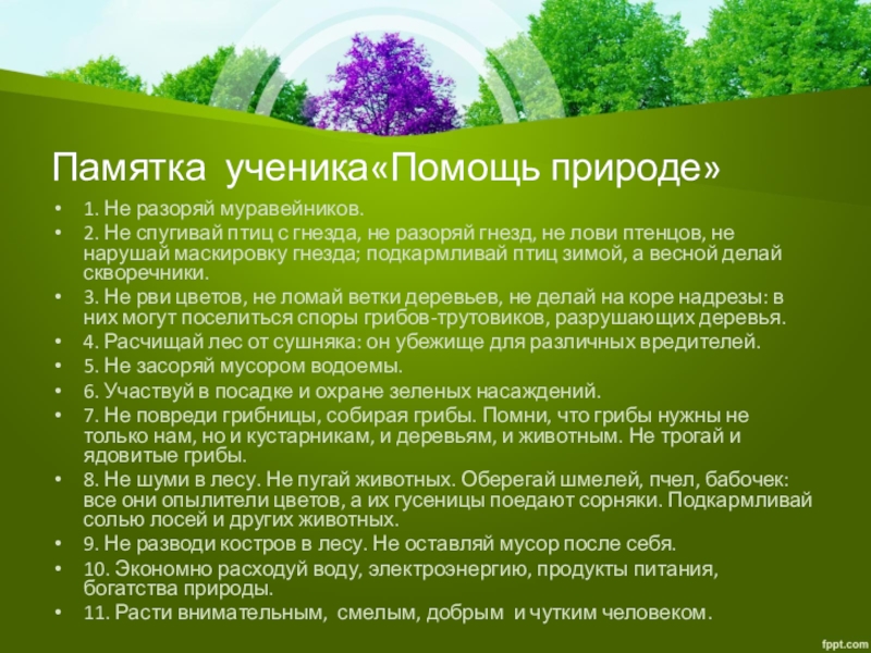 3. Не рви цветов, не ломай ветки деревьев, не делай на коре надрезы: в них могут поселиться споры грибов-трутовиков, разрушающих деревья.