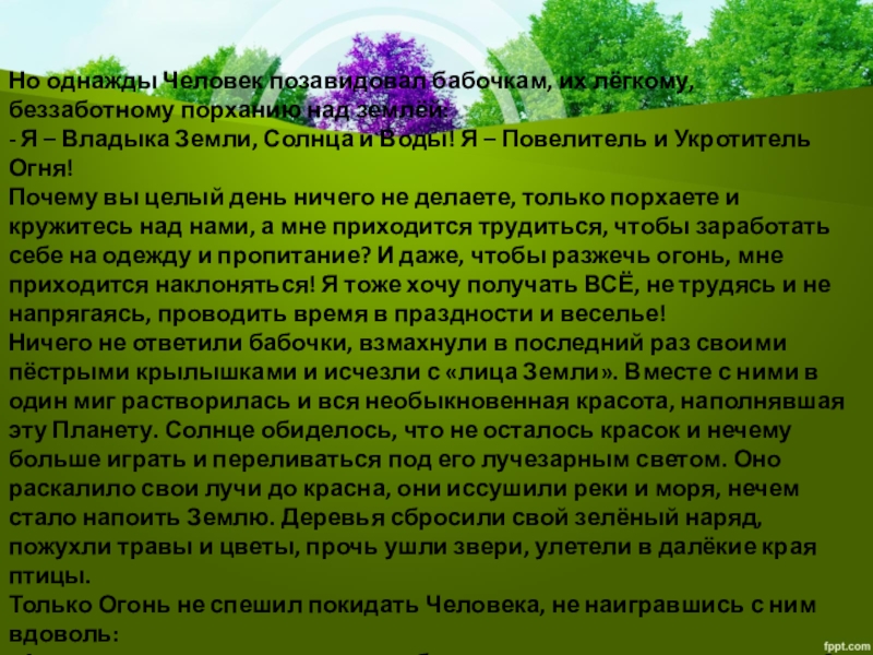 Почему вы целый день ничего не делаете, только порхаете и кружитесь над нами, а мне приходится трудиться, чтобы заработать себе на одежду и пропитание? И даже, чтобы разжечь огонь, мне приходится наклоняться! Я тоже хочу получать ВСЁ, не трудясь и не напрягаясь, проводить время в праздности и веселье!
