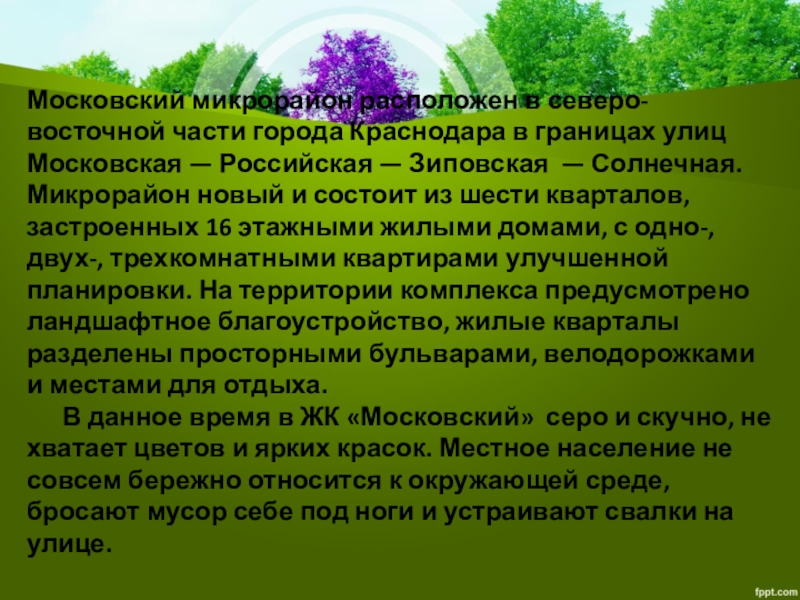 В данное время в ЖК «Московский» серо и скучно, не хватает цветов и ярких красок. Местное население не совсем бережно относится к окружающей среде, бросают мусор себе под ноги и устраивают свалки на улице.