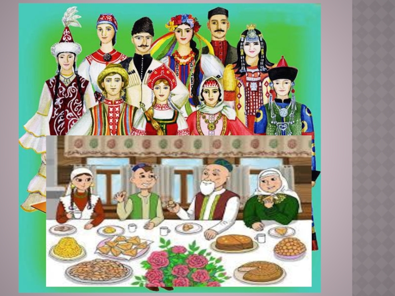 народными национальными костюмами, национальными блюдами, героями, музыкальными инструментами.