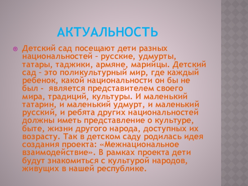 АктуальностьДетский сад посещают дети разных национальностей – русские, удмурты, татары, таджики,