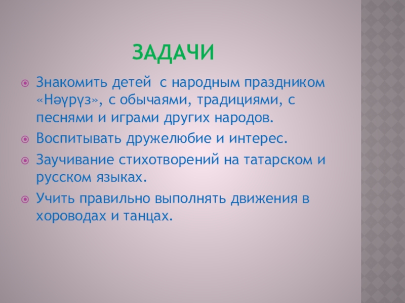 задачиЗнакомить детей с народным праздником «Нәүрүз», с обычаями,