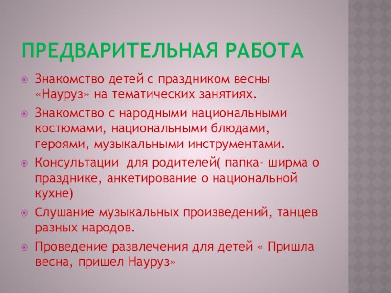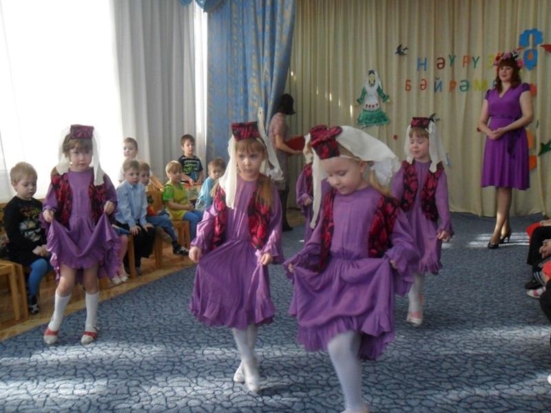 Предварительная работаЗнакомство детей с праздником весны «Науруз» на тематических занятиях.Знакомство с народными национальными костюмами, национальными блюдами, героями,