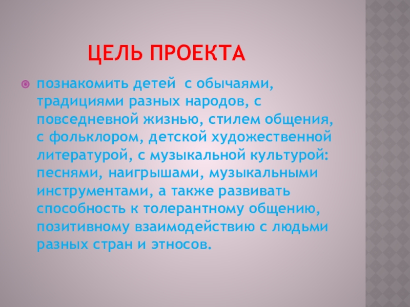 Цель проектапознакомить детей  с обычаями, традициями разных народов, с повседневной жизнью, стилем