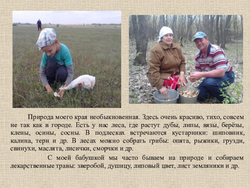 красиво, тихо, совсем не так как в городе. Есть у нас леса, где растут дубы, липы, вязы, берёзы, клены, осины, сосны. В подлесках встречаются кустарники: шиповник, калина, терн и др. В лесах можно собрать грибы: опята, рыжики, грузди, свинухи, маслята, лисички, сморчки и др.