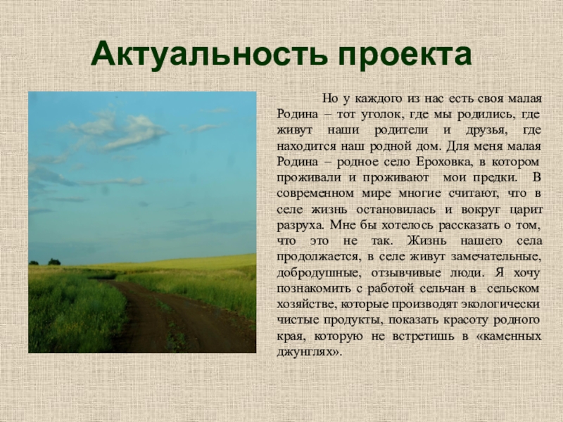 тот уголок, где мы родились, где живут наши родители и друзья, где находится наш родной дом. Для меня малая Родина – родное село Ероховка, в котором проживали и проживают мои предки. В современном мире многие считают, что в селе жизнь остановилась и вокруг царит разруха. Мне бы хотелось рассказать о том, что это не так. Жизнь нашего села продолжается, в селе живут замечательные, добродушные, отзывчивые люди. Я хочу познакомить с работой сельчан в сельском хозяйстве, которые производят экологически чистые продукты, показать красоту родного края, которую не встретишь в «каменных джунглях».