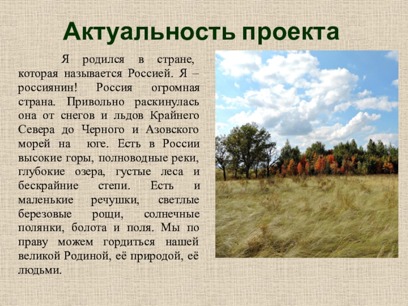 Россия огромная страна. Привольно раскинулась она от снегов и льдов Крайнего Севера до Черного и Азовского морей на юге. Есть в России высокие горы, полноводные реки, глубокие озера, густые леса и бескрайние степи. Есть и маленькие речушки, светлые березовые рощи, солнечные полянки, болота и поля. Мы по праву можем гордиться нашей великой Родиной, её природой, её людьми.