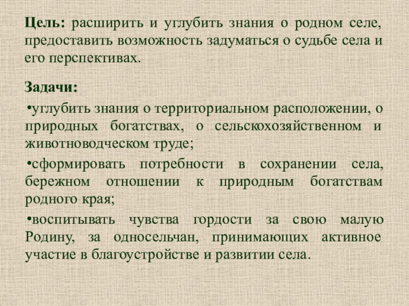 Слайд 4Цель: расширить и углубить знания о родном селе, предоставить возможность задуматься