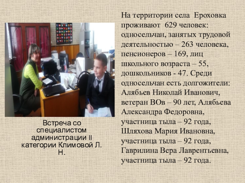 Слайд 11Встреча со специалистом администрации II категории Климовой Л.Н.