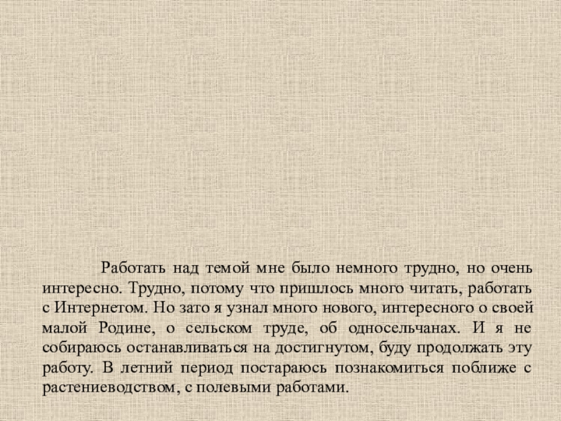 трудно, но очень интересно. Трудно, потому что пришлось много читать, работать с Интернетом. Но зато я узнал много нового, интересного о своей малой Родине, о сельском труде, об односельчанах. И я не собираюсь останавливаться на достигнутом, буду продолжать эту работу. В летний период постараюсь познакомиться поближе с растениеводством, с полевыми работами.