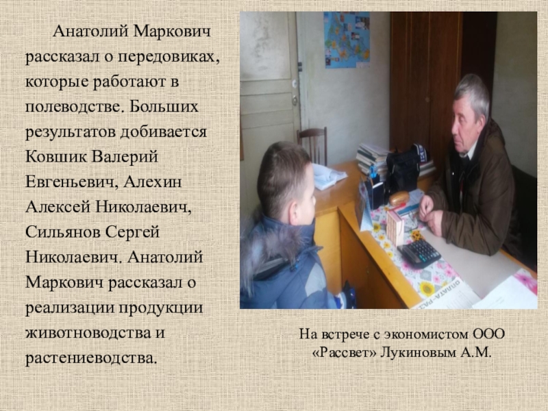 Слайд 12Анатолий Маркович рассказал о передовиках, которые работают в полеводстве. Больших результатов